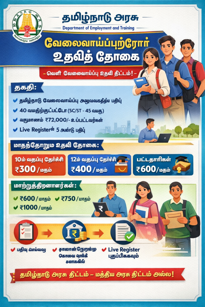 இந்த உதவித் தொகை மத்திய அரசு திட்டம் அல்ல; இது தமிழ்நாடு அரசு வேலைவாய்ப்பு மற்றும் பயிற்சி துறையினால் நடத்தப்படும் வேலைவாய்ப்பற்றோர் உதவித் திட்டமாகும்.