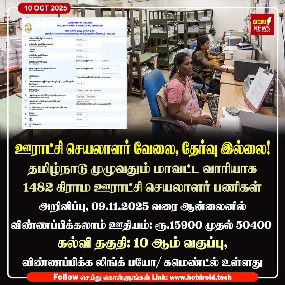 தமிழ்நாடு ஊரக வளர்ச்சி மற்றும் ஊராட்சித்துறையில் உள்ள அலுவலக உதவியாளர், ஓட்டுநர், எழுத்தர், காவலர் உள்ளிட்ட பதவிகளுக்கு பணியிடங்கள் நிரப்ப கடந்த மாதம் அறிவிப்பு வெளியாகி, விண்ணப்பங்கள் பெறப்பட்ட நிலையில், தற்போது கிராம ஊராட்சி செயலர் பதவிக்கான அறிவிப்பு வெளியாகியுள்ளது.