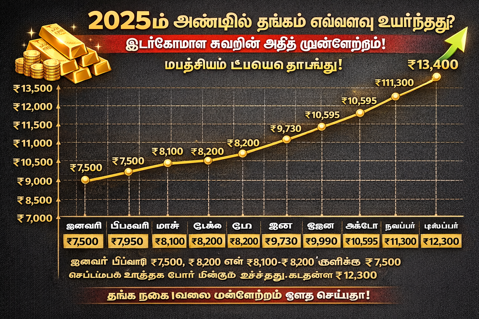 செப்டம்பரில் வர்த்தக போர் மீண்டும் உச்சம் அடைந்தது. இதனால் ஏற்பட்ட உலகளாவிய நிச்சயமற்ற தன்மையால் தங்கம் மீதான முதலீடுகள் பெருக.. தங்கம் ஒரு கிராமுக்கு சுமார் ₹10,595 ஆக உயர்ந்தது. அக்டோபரில் இதே நிலை தொடர்ந்தது. இதனால் தங்கம் விலை ஒரு கிராமுக்கு ₹11,900ஐத் தாண்ட வைத்தது. இது 2025ம் ஆண்டின் மிகக் கூர்மையான உயர்வுகளில் ஒன்றாகும். நவம்பரிலும் விலை ₹12,300 ஆக மேலும் உயர்ந்தது.