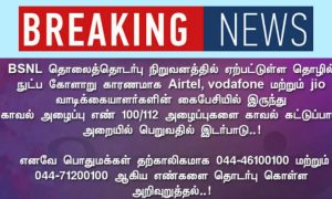 சென்னை: காவல்துறை அவசர அழைப்பு எண் 100, 112 தற்காலிகமா மாற்றம் செய்யப்பட்டதாக அறிவிக்கப்பட்டுள்ளது. BSNL தொலைத்தொடர்பு நிறுவனத்தில் ஏற்பட்டுள்ள தொழில்நுட்ப கோளாறு காரணமாக Airtel, Vodafone மற்றும் jio வாடிக்கையாளர்களின் கைபேசியில்...